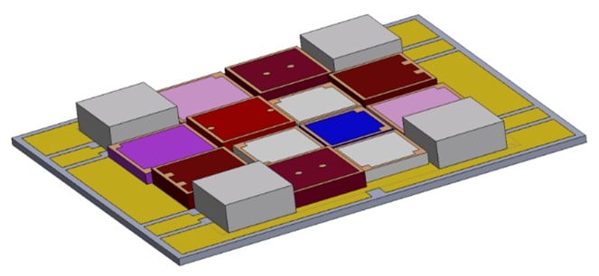 Figure 1: 4×4 array of close-packed LED die shows variation in size and height for deep UV through NIR LEDs that requires special consideration for die attach, wire bonding, and cooling.