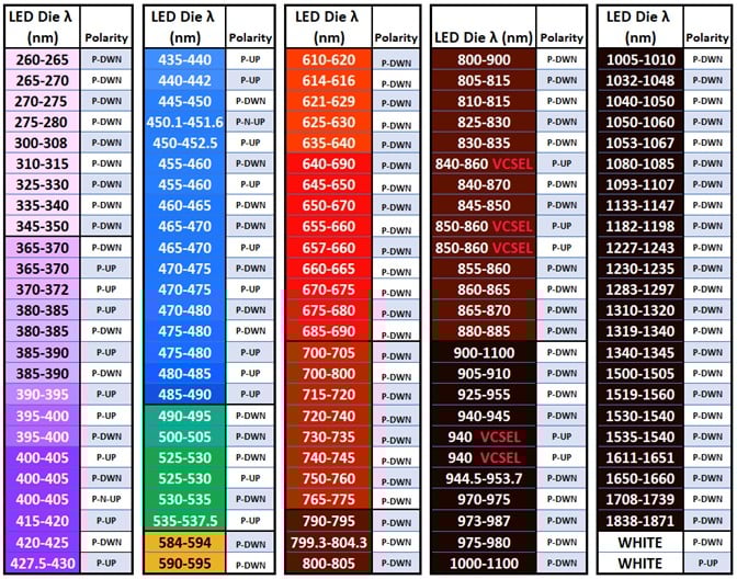 Manufacturers produce LED die for wavelengths ranging from lower UV to NIR, but output power and efficiency vary. Consequently, manufacturers sort and sell them in groups, called bins, according to power and wavelength ranges. Multiple bins of LED die exist in the UVA, visible, white, and NIR wavelengths. Figure 2 illustrates a sampling of die used at IOI, though not all bins are shown. Deep UV die below 365nm are flip-chip type.