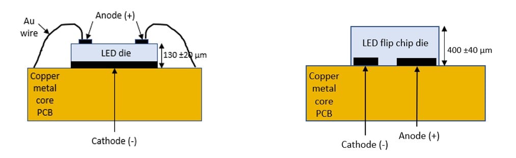 Figure 3: Regular LED chips ( > 365nm) require wire bonds, but LED Flip-chip (deep UV) has electrical contacts placed on the bottom and attaches directly to the PCB or heat sink.