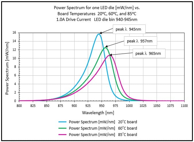 Figure 4: Peak wavelength shifts longer, FWHM broadens, and optical power decreases with an increase in board temperature for this 940nm LED die.