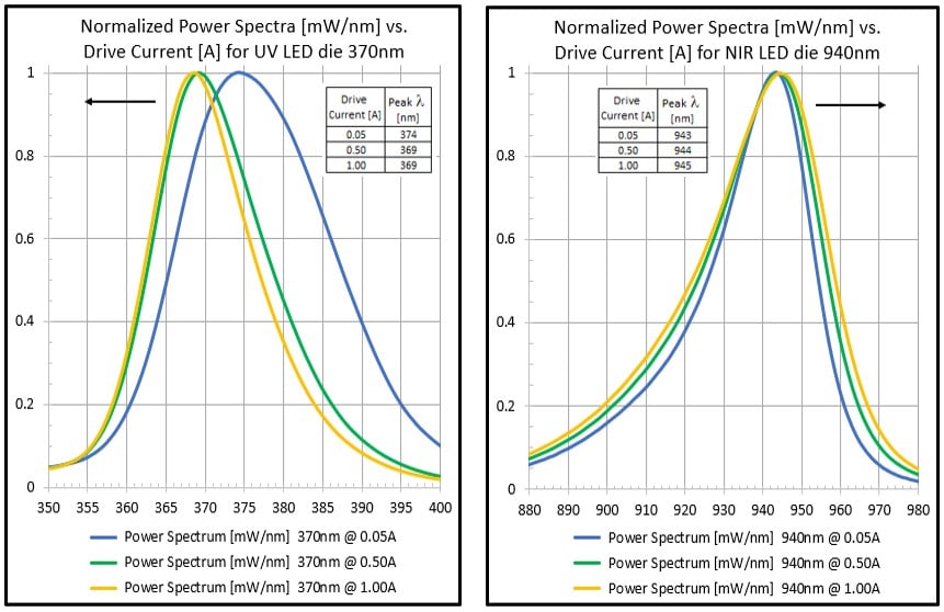 Figure 5: Higher drive currents cause a shift to shorter peak wavelength for the UV and a shift to longer peak wavelength for NIR.