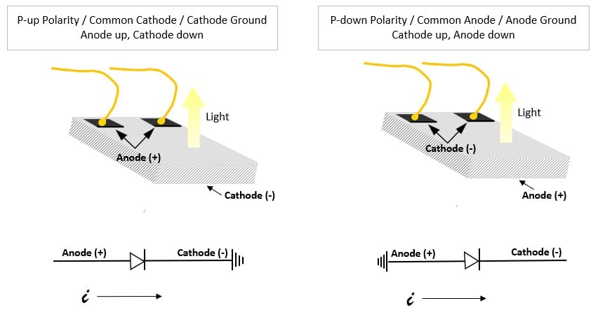 Figure 6: One LED die each with P-up or P-down polarity and associated terminology.