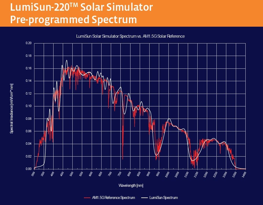 The LumiSun-220™ is a cost-effective LED solar simulator delivering Class A+A+A+ performance over a 220 mm × 220 mm area at a 600 mm working distance. It features 36 individually controlled wavelengths from 350 nm to 1250 nm with minimal spectral deviation. Irradiance is adjustable from 0.1 to 1.2 Suns in steady-state or pulsed modes. TEC cooling and closed-loop current control ensure excellent temporal stability and long-term reliability.